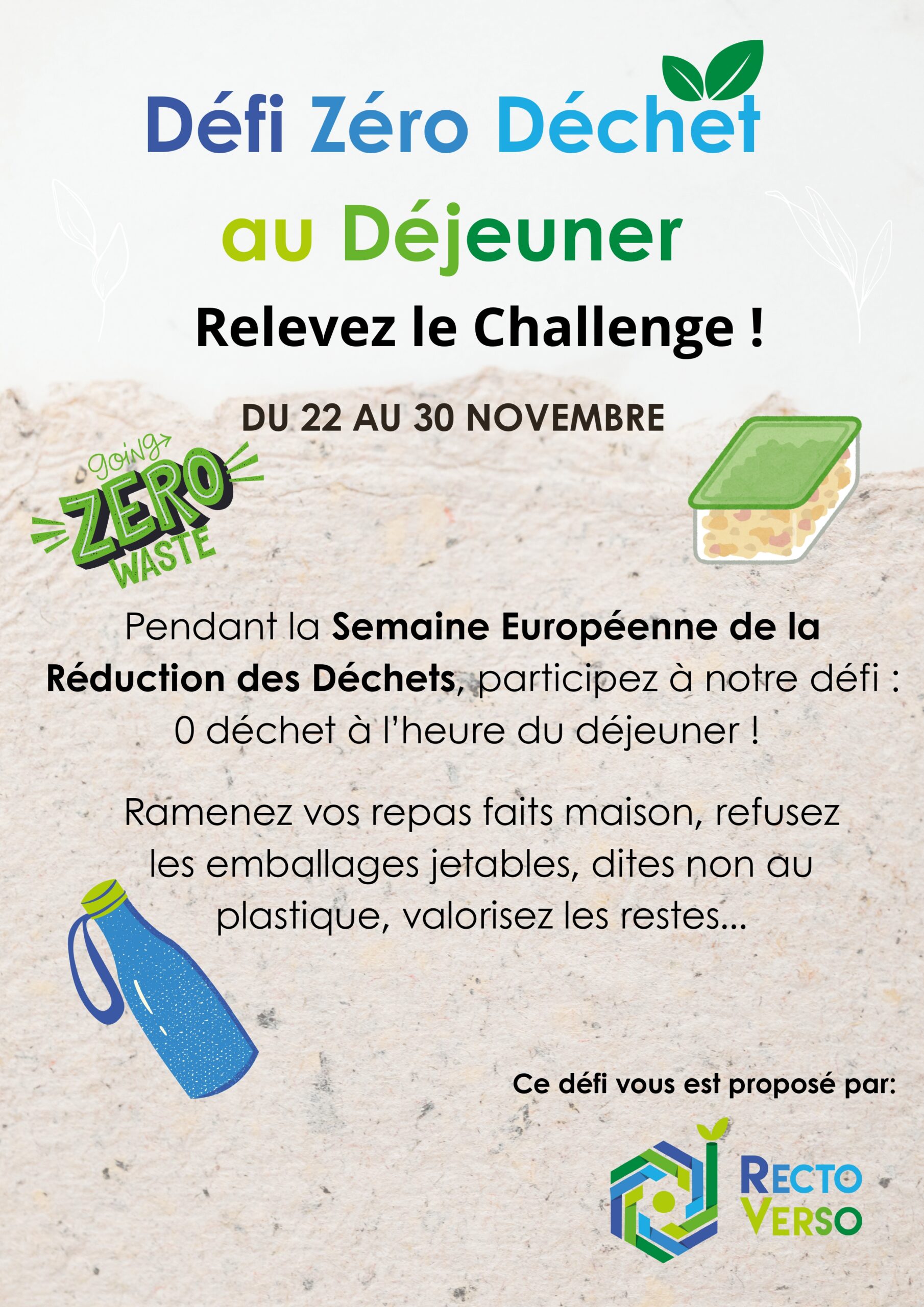Nous vous invitons à mobiliser vos équipes autour d’un défi : réduire les déchets pendant la pause déjeuner. Boîtes réutilisables, gourdes, repas faits maison… chaque geste compte !